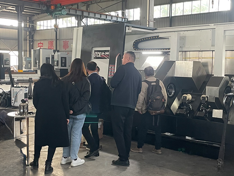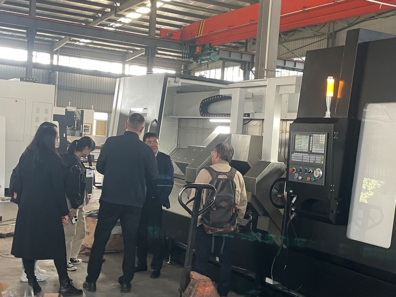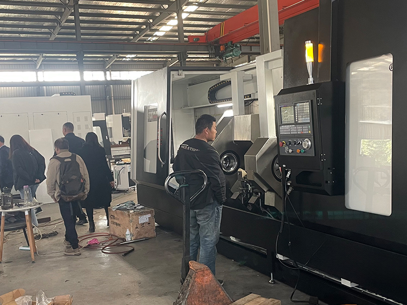 客户来车间查看斜式双头车了解加工工件需求